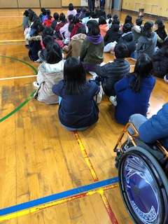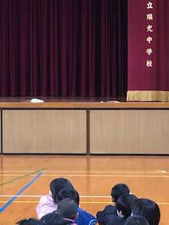 6年生が瑞光中学校に中学校体験に行きました。体育館で中学校の先生の話を聞いています。