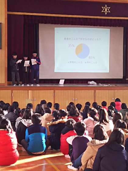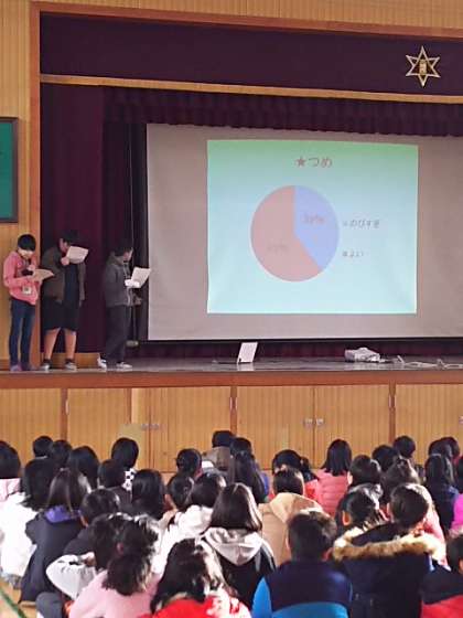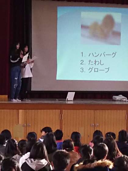 今日は児童集会がありました。健康給食委員会の児童が、保健や給食のクイズや調理員さんにインタビュー、感謝の手紙の贈呈を行いました。