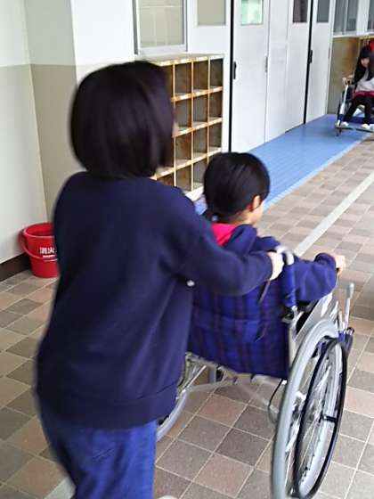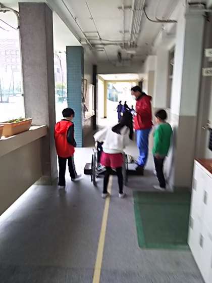 車椅子に乗ったり、押したりする体験をしました。段差や障害物に気をつけて動かしています。