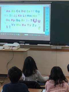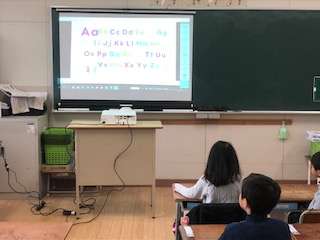 朝の英語タイムです。1年生もたくさんの子どもたちがアルファベットを覚えています。