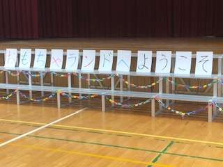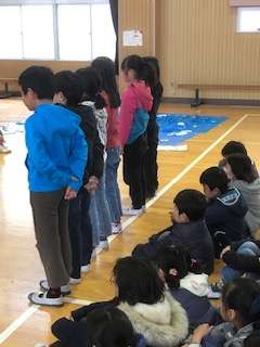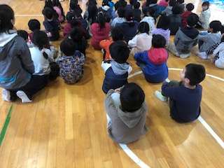 4月から1年生になる幼稚園や保育園の子どもたちを2年生が迎えて、いっしょに遊びます。おもちゃは2年生が作ったものです。