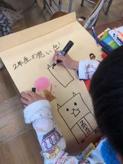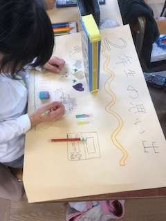 1年間の作品を入れる袋に絵を描いています。大切な2年生の思い出がいっぱい中に入ることでしょう。