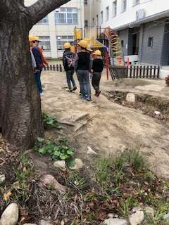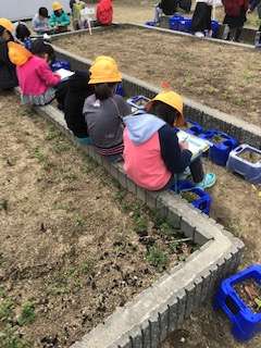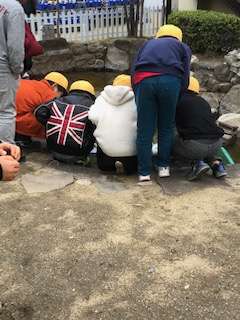 2年生が春探しでチューリップの観察や学習園、池で生き物探しをしています。