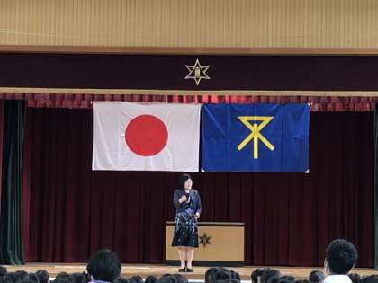 その後、離任の先生のあいさつがあり、最後に全員で校歌を歌いました。