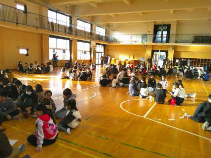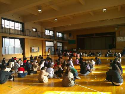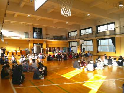 毎週木曜日は、児童集会の日です。とても寒い朝でしたが、講堂には南から太陽の光が入って明るく、外より温かく感じました。