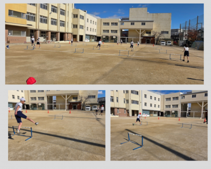 運動場で元気いっぱいハードル走をしている6年生を見つけました。