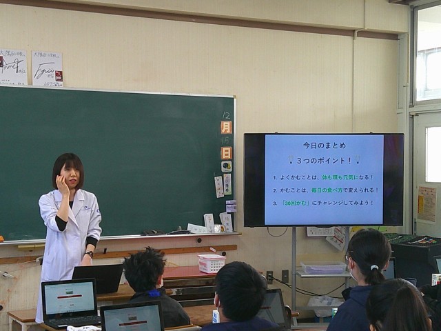 食べ物を食べるときに、よく噛んで食べることが大切だとよく言われますが、授業の前半では、噛むことはなぜ大切なのか、よく噛んで食べることでどのような効果があるのかなどについて、クイズやイラストを用いてわかりやすく教えていただきました。よく噛むためのポイントとして「口いっぱいにほおばらない」「しっかりお口を動かして噛む」「飲み物で流しこまない」「左右の歯をバランスよく使う」「足をついて姿勢をよくして食べる」などを教えていただきました。