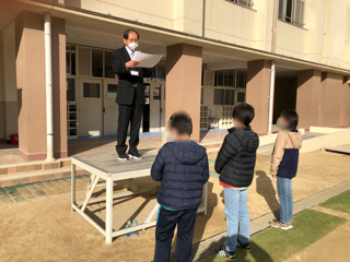 給食や清掃の後、2学期の終業式を児童どうしの間隔を開けて運動場で行いました。はじ...
