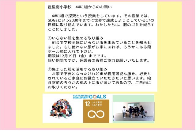 4年1組では、探究の時間SDGsの活動に取り組んでいます。服のリサイクルにご協力...