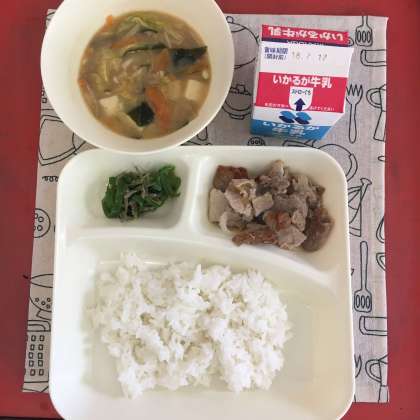 今日の献立は、豚肉のおろしじょうゆかけ、みそ汁、じゃこピーマン、ごはん、牛乳でした。