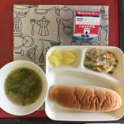 今日の献立は、マカロニグラタン、レタスのスープ、りんご(カット缶)、おさつパン、牛乳でした。