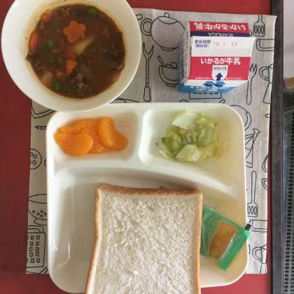 今日の献立は、ビーフシチュー、キャベツのピクルス、みかん(缶)、食パン、りんごジャム、牛乳でした。