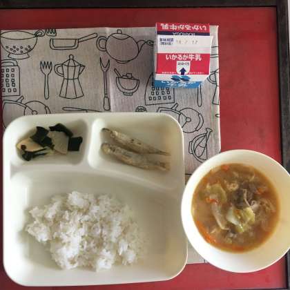 今日の献立は、きびなごてんぷら、豚汁、わかたけ煮、ごはん、牛乳でした。
