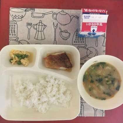 今日の献立は、赤魚のしょうゆだれかけ、みそ汁、えんどうのたまごとじ、ごはん、牛乳でした。