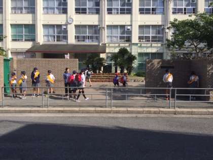 毎朝、正門に計画委員の児童が立って、元気にあいさつを交わしています。