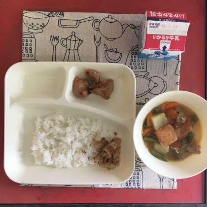 今日の献立は、鶏肉のてりやき、じゃがいもとあつあげの煮もの、ごまかかいため、ごはん、牛乳でした。
