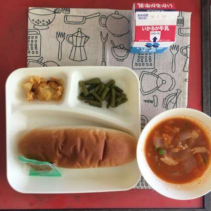 今日の献立は、ケチャップ煮、さんどまめのソテー、りんごのクラフティ、コッペパン、りんごジャム、牛乳でした。
