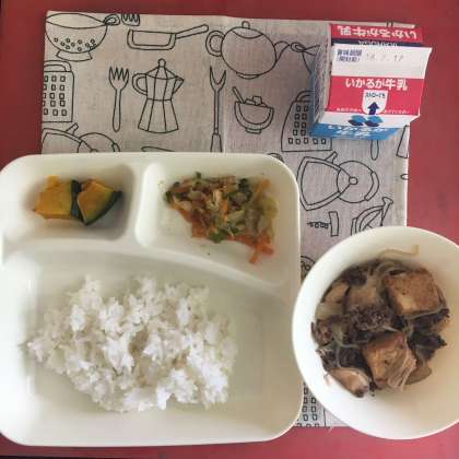 今日の献立は、すき焼き煮、焼きかぼちゃ、野菜のそぼろいため、ごはん、牛乳でした。