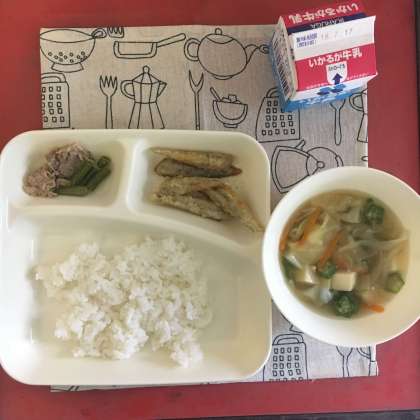 今日の献立は、いわしてんぷら、すまし汁、豚肉とさんどまめのいためもの、ごはん、牛乳でした。