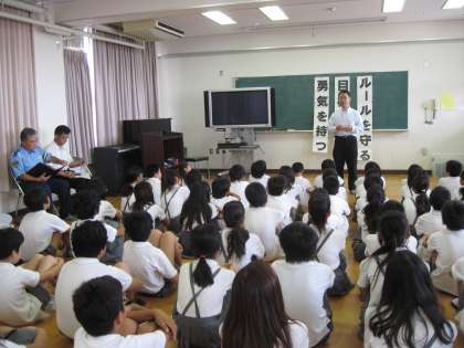 7月17日(水)3時限目。6年生は、東淀川警察署の方に3名に来ていただいて非行防止教室を行いました。携帯電話の使い方や自転車に乗り方などのお話を聞きました。「ルールを守る、目標を持つ、断る勇気を持つ」ことを心に刻み、夏休みも安全に過ごしてほしいものです。