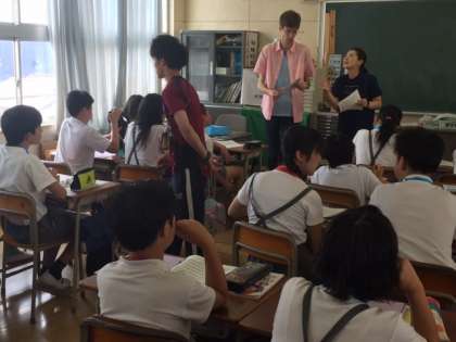 今日はC=NETのポール・シャフ先生、東淀中学校の笠作麻利子先生(英語担当)、その指導教官の森先生、インターンシップで来られた成蹊大学のなるみ先生、それに前島先生と束になって「これでもか」と思えるくらいたくさんの先生方が指導してくださいました。おまけに、短時間ですがこの写真を撮るために私(校長)も加わりました。