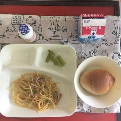 今日の献立は、ポークトマトスパゲッティ、グリーンアスパラガス、発酵乳、1/2黒糖パン、牛乳でした。