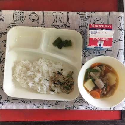 今日の献立は、豚肉とじゃがいもの煮もの、オクラの甘酢あえ、ツナっ葉いため、ごはん、牛乳でした。