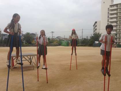 新しく竹馬が15組入りました。子ども達は、さっそく見つけて休み時間や放課後に乗って遊んでいます。小学校の時代には平衡性、巧緻性などの調整力を高めることが大切です。そのために竹馬や一輪車に乗って遊ぶことはとても良いことです。取り合いしないように安全に楽しんでほしいものです。新しい一輪車も40台入る予定です。
