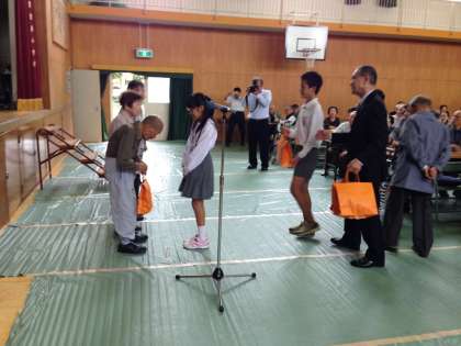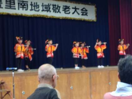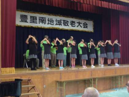 10月5日(日)第24回豊里南地域敬老大会が本校講堂で盛大に開催されました。 70歳を越える方が200人以上集まり、地域をあげて長寿をお祝いしました。豊里南小学校からは、6年生の代表2名が参加し、お祝いの言葉を述べるとともに、90歳以上なる方への記念品贈呈のお手伝いもしました。そして、5.6年生全員で書いたお手紙も渡しました。また、4.5年生で生涯学習のコーラスに入っている子ども達は手話コーラスでも参加しました。お年寄りの方は、食事をしたり、バトントワラーや和太鼓演奏、民踊などの演芸を見たり、お楽しみ抽選会に参加したりして楽しい1日を過ごされました。これからも長生きされることを願っております。