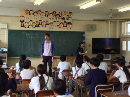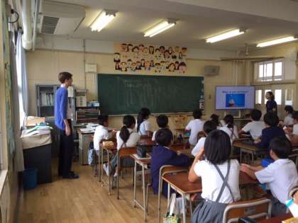 担任の先生といっしょに、東淀中学校のポール先生と笠作先生に来ていただき、生きた英語の授業です。