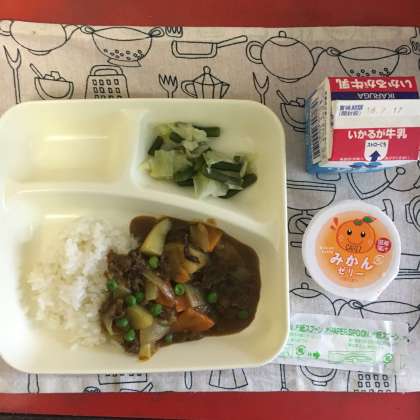 今日の献立は、ビーフカレーライス(米粉)、野菜のピクルス、みかんゼリー、牛乳でした。