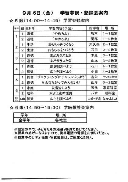 9月6日(金)午後2時から、学習参観・学級懇談会を行います。