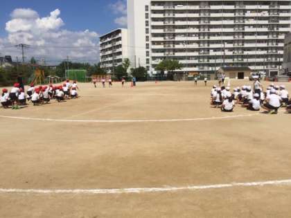 見ると4年生が運動会の練習をしています。台風の目?思わず写真をパチリ。
