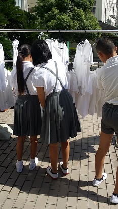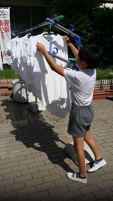 家庭科の学習で体操服を洗濯しました。手でパンパンと叩き、表面のしわを伸ばして干すと乾きやすいことを学びました。家でも洗濯物を上手に干してね。