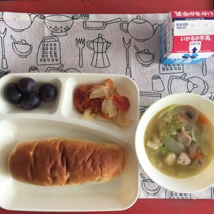 今日の献立は、鶏肉とてぼ豆のスープ煮、じゃがいもとトマトのチーズ焼き、ぶどう(巨峰)、おさつパン、牛乳でした。