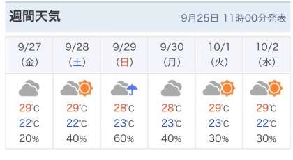 週間天気予報を見ると、日曜日は雨模様(サイトによって多少予報が違います)。