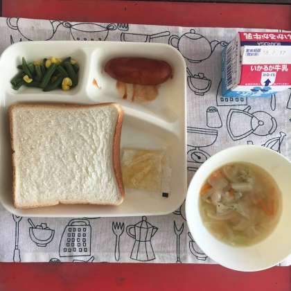 今日の献立は、フランクフルトのケチャップソース、スープ、さんどまめとコーンのサラダ、食パン、マーマレード、牛乳でした。