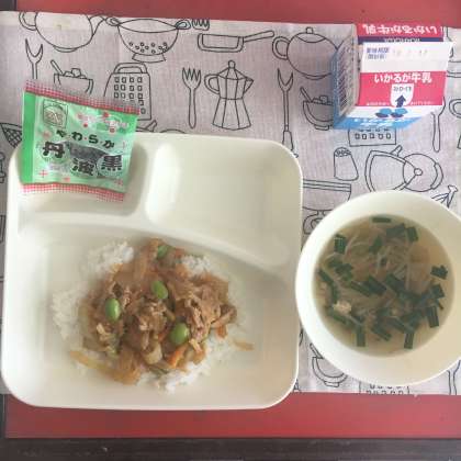 今日の献立はピリ辛丼、中華スープ、ソフト黒豆、牛乳でした。
