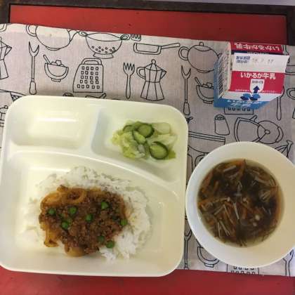 今日の献立は、タコライス、もずくと白ねぎのスープ、キャベツときゅうりのサラダ、牛乳でした。