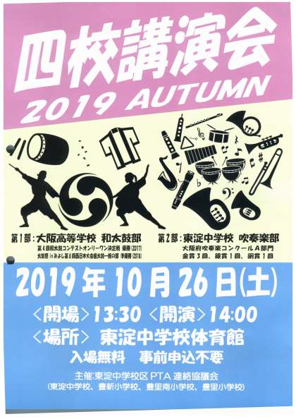 大阪高等学校 和太鼓部 や 東淀中学校 吹奏楽部 の演奏があります。