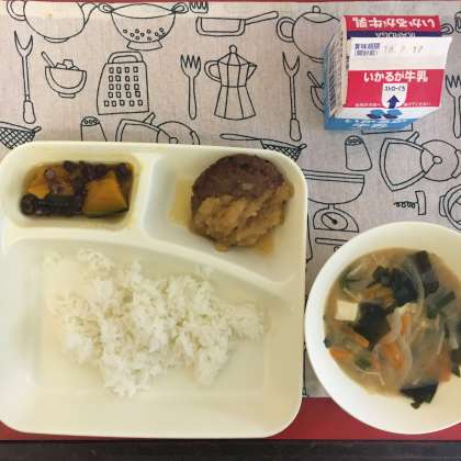 今日の献立は、和風おろしハンバーグ、みそ汁、かぼちゃのいとこ煮、ごはん、牛乳でした。