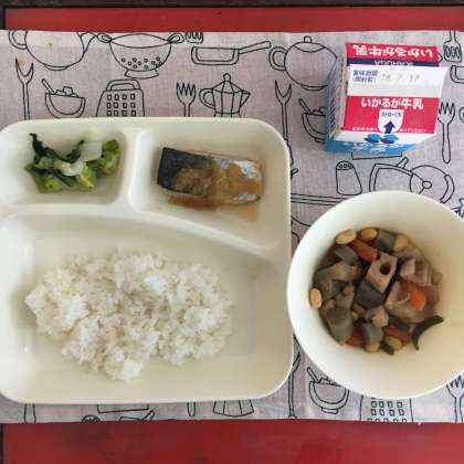 今日の献立は、さごしのおろしじょうゆかけ、五目豆、こまつなとはくさいの甘酢和え、ごはん、牛乳でした。