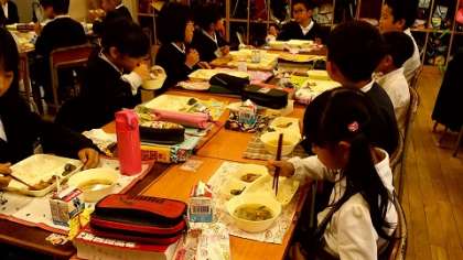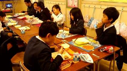 今日は、交流給食。いつも木曜日の集会で一緒に活動している縦割り班のメンバーで給食を食べました。おかわりをする児童も多くみられました。