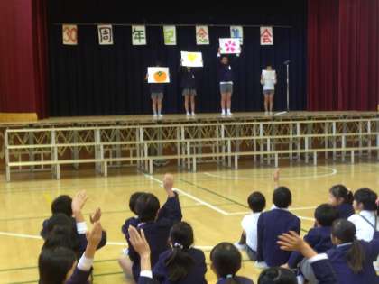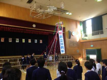 10月30日(木)朝の児童集会の時間に児童会が中心となって創立30周年記念集会を開きました。校長先生のお話の後、豊里南小学校についてのクイズをしたり、くす玉わりをしたりして楽しみました。最後に校歌をみんなで歌って学校の創立30周年をお祝いしました。クイズもよく考えられていて盛り上がり、とても楽しい集会になりました。