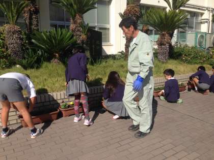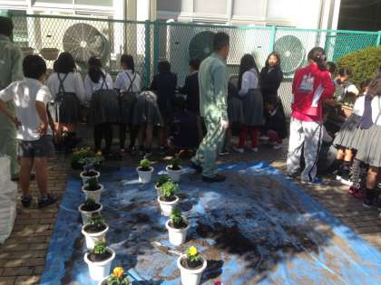 季節が夏から秋に変わり、玄関に植えてあったプランターの房花が枯れてきたため、10月30日(木)昼休みにパンジー等の苗を植えました。各クラスの代表が集まり、管理作業員さんの指導のもとていねいに植え付けていきました。冬から春にかけて大きく育ち、毎朝子ども達をやさしく迎えてくれることでしょう。