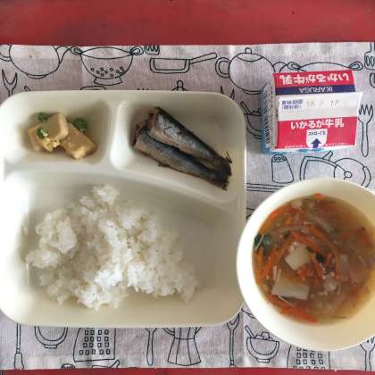 今日の献立は、いわしのしょうが煮、うすくず汁、高野どうふの卵とじ、ごはん、牛乳でした。
