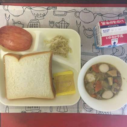 今日の献立は、八宝菜、もやしのごま酢あえ、りんご、食パン、アプリコットジャム、牛乳でした。