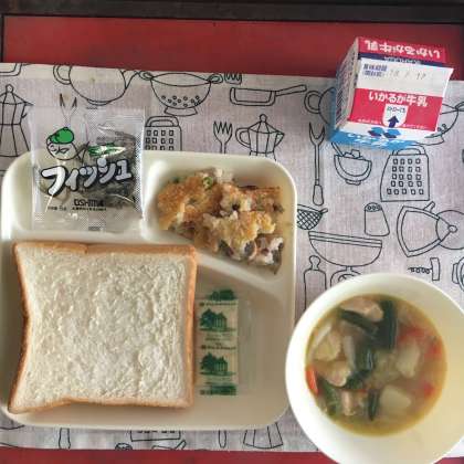 今日の献立は、鶏肉とじゃがいものスープ煮、きのこのドリア、ミニフィッシュ、食パン、ソフトマーガリン、牛乳でした。