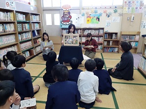 今日の昼休みは、2020年になって初めての本の読み聞かせ。図書ボランティアの「はなはな」さんに、お正月にちなんだ紙芝居「おしょうがつのおきゃくさん」の読み聞かせをしていただきました。子どもたちはお話の世界に引き込まれ、静かに聞き入っていました。