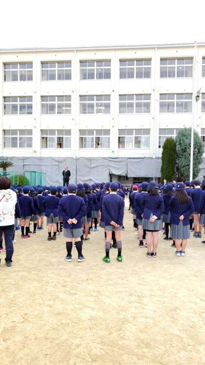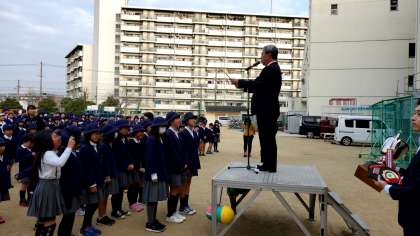 まず初めに、本校のキックべースボールチームが昨日行われた「頑固おやじ大会」で優勝し、その表彰伝達式を行いました。キックベースボールチームのみんな、おめでとう!次の大会も頑張ってね!